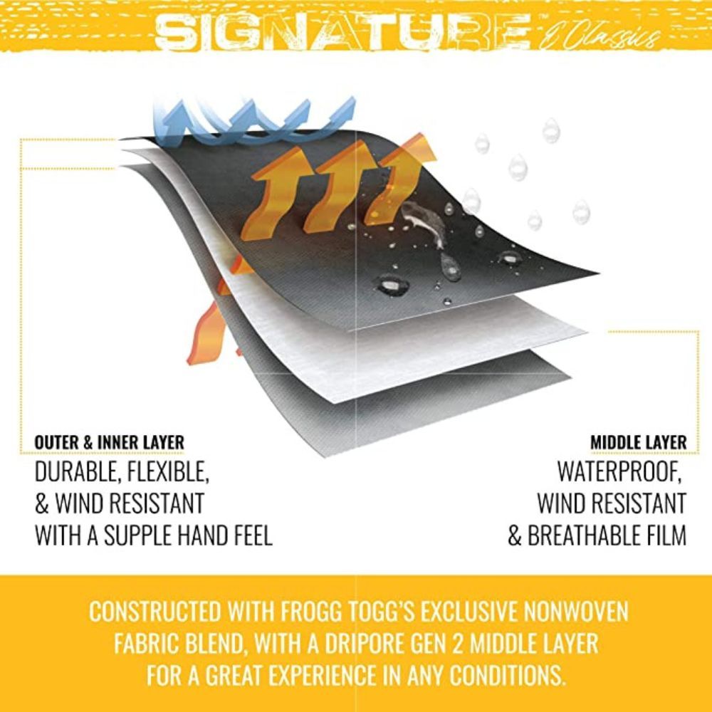 Frogg Toggs are a brand of clothing known for its three-layer polypropylene construction and welded seams. The fabric is lightweight and breathable, making it ideal for activities in hot or humid weather.